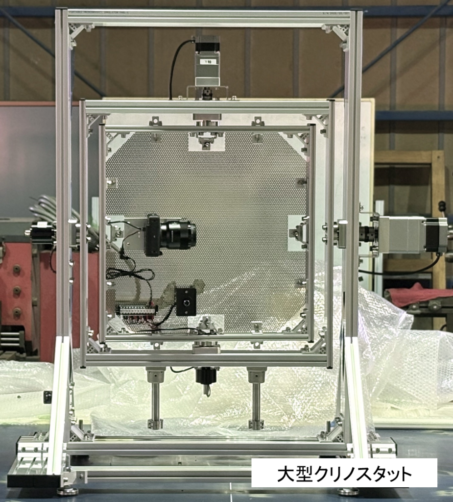 クリノスタットとは、搭載した試料を直交する2軸により3次元に回転させます。この時、重力方向を連続的に変化させ、搭載試料が重力刺激を受ける前に方向を変えることで、重力ベクトルを分散させて重力の影響を少なくする微小重力模擬装置です。